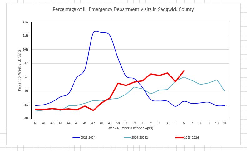 - Seasonal influenza activity in Sedgwick County has increased compared to previous weeks.