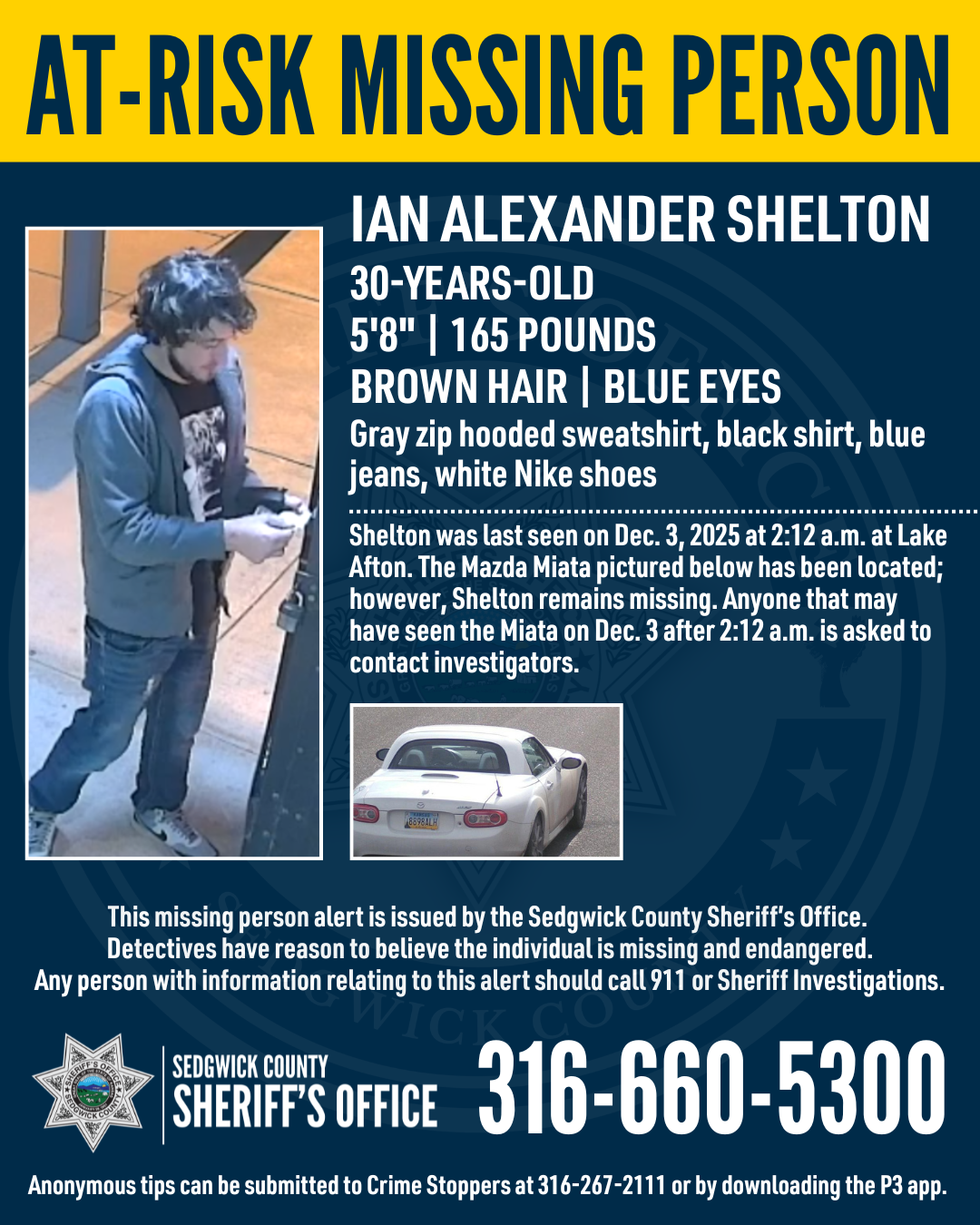 SEDGWICK COUNTY, Kan. — The Sedgwick County Sheriff’s Office continues to investigate the disappearance of Ian Alexander Shelton, a 30-year-old man reported missing and considered endangered.